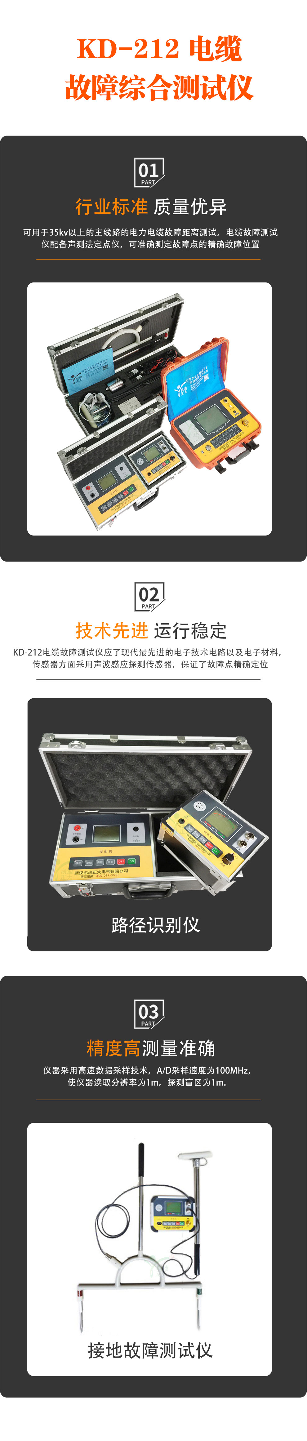 KD-212電纜故障測試儀是一套綜合性的電纜故障探測儀器。能對電纜的高阻閃絡故障,高低阻性的接地,短路和電纜的斷線,接觸不良等故障進行測試,若配備聲測法定點儀,可準確測定故障點的精確位置。特別適用于測試各種型號、不同等級電壓的電力電纜及通信電纜。