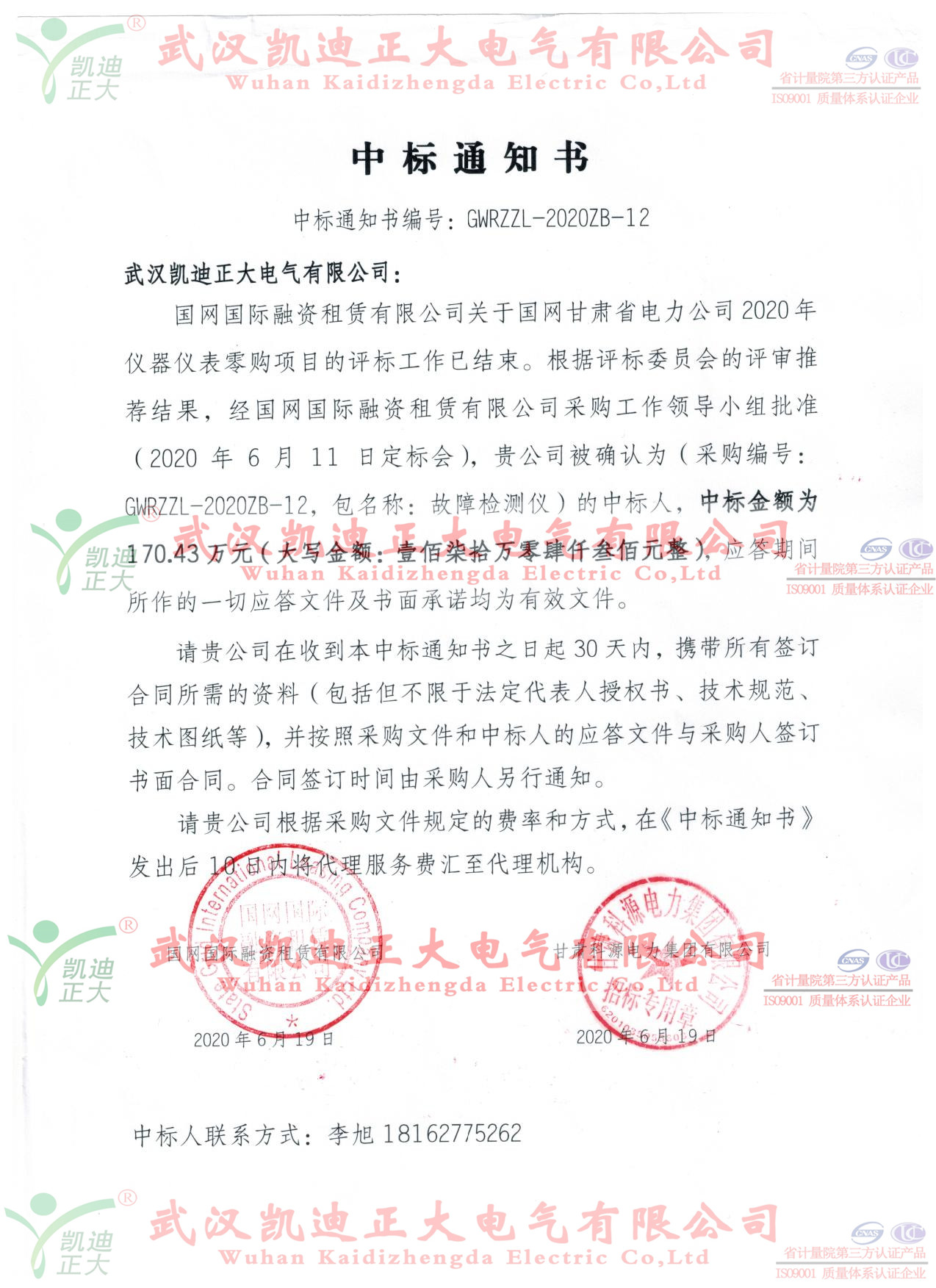 疫情結(jié)束了,一年一度的高考也結(jié)束了。該是分享成功的時候,我們倍感高興。武漢凱迪正大電氣有限公司迎來了國網(wǎng)國際融資租賃有限公司的中標通知書,這是疫情解封武漢市以來我司獲得的第9張中標通知書,中標金額排名第三!