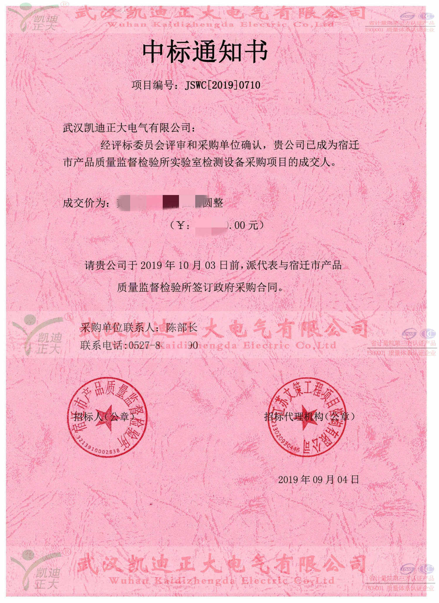 2019年9月份,受邀參與隸屬于宿遷市質(zhì)量技術(shù)監(jiān)督局的宿遷市產(chǎn)品質(zhì)量監(jiān)督檢驗(yàn)所實(shí)驗(yàn)室檢測設(shè)備采購項(xiàng)目,并以最高分獲得中標(biāo)人。因武漢疫情等影響昨日收到宿遷質(zhì)檢所的中標(biāo)通知書。