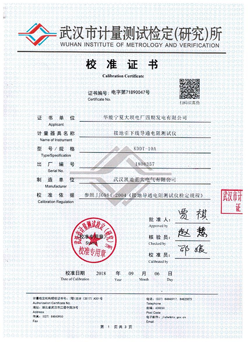武漢凱迪正大KDDT-10A接地引下線導通電阻測試儀校準證書