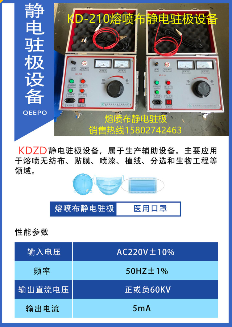 KDZD5020熔噴布靜電駐極設(shè)備參數(shù): 高壓輸出:自動(dòng)聲壓 恒壓輸出 安全措施:自動(dòng)檢測電流變化,反折保護(hù)電路特性 輸入電壓:220VAC,50Hz 輸出電壓:DC 0-120KV,負(fù)極性,輸出功率:200W-30000W可以定制,輸出電流2mA-10000mA可以定制。可調(diào)故障處理:過電壓,過電流自動(dòng)跳脫 適用環(huán)境:0-40攝氏度。