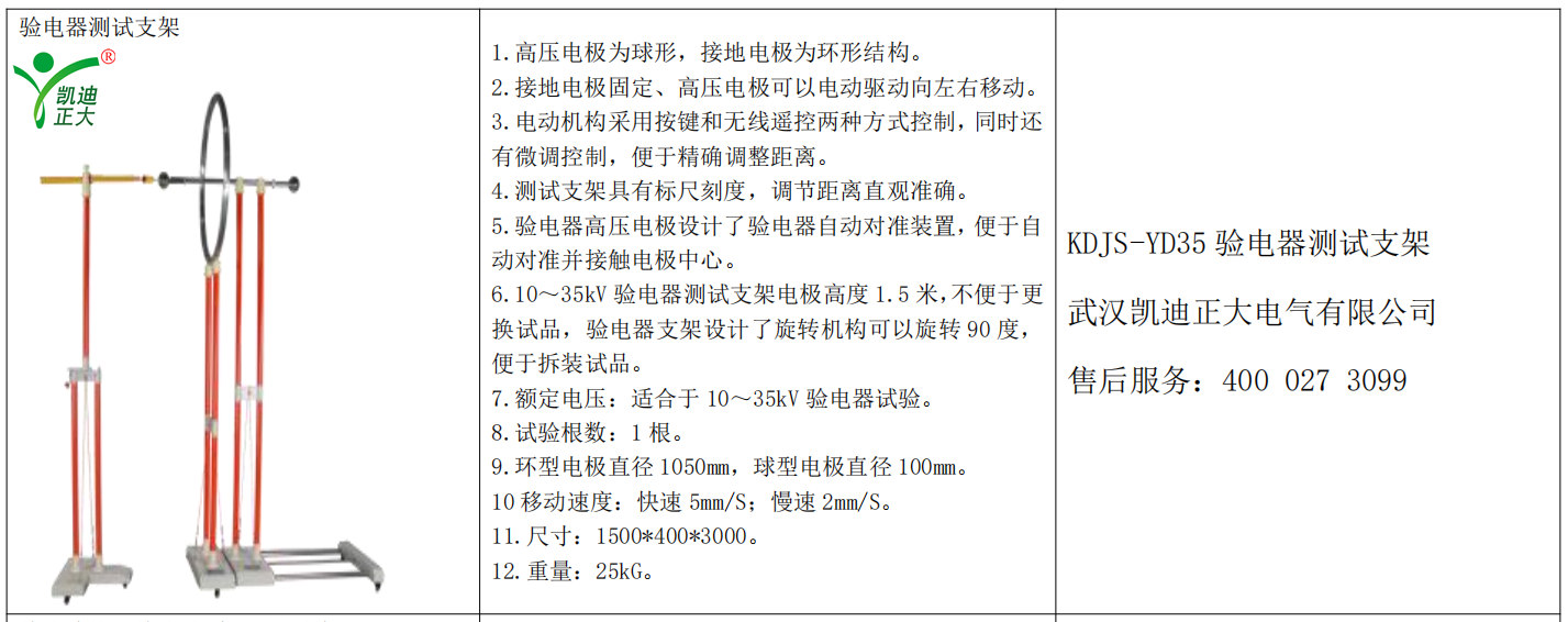 高壓電極為球形,接地電極為環形結構。接地電極固定、高壓電極可以電動驅動向左右移動。電動機構采用按鍵和無線遙控兩種方式控制,同時還有微調控制,便于精確調整距離。測試支架具有標尺刻度,調節距離直觀準確。驗電器高壓電極設計了驗電器自動對準裝置,便于自動對準并接觸電極中心。10~35kV驗電器測試支架電極高度1.5米,不便于更換試品,驗電器支架設計了旋轉機構可以旋轉90度,便于拆裝試品。額定電壓:適合于10~35kV驗電器試驗。試驗根數:1根。環型電極直徑1050mm,球型電極直徑100mm。移動速度:快速5mm/S;慢速2mm/S。尺寸:1500*400*3000。重量:25kG。