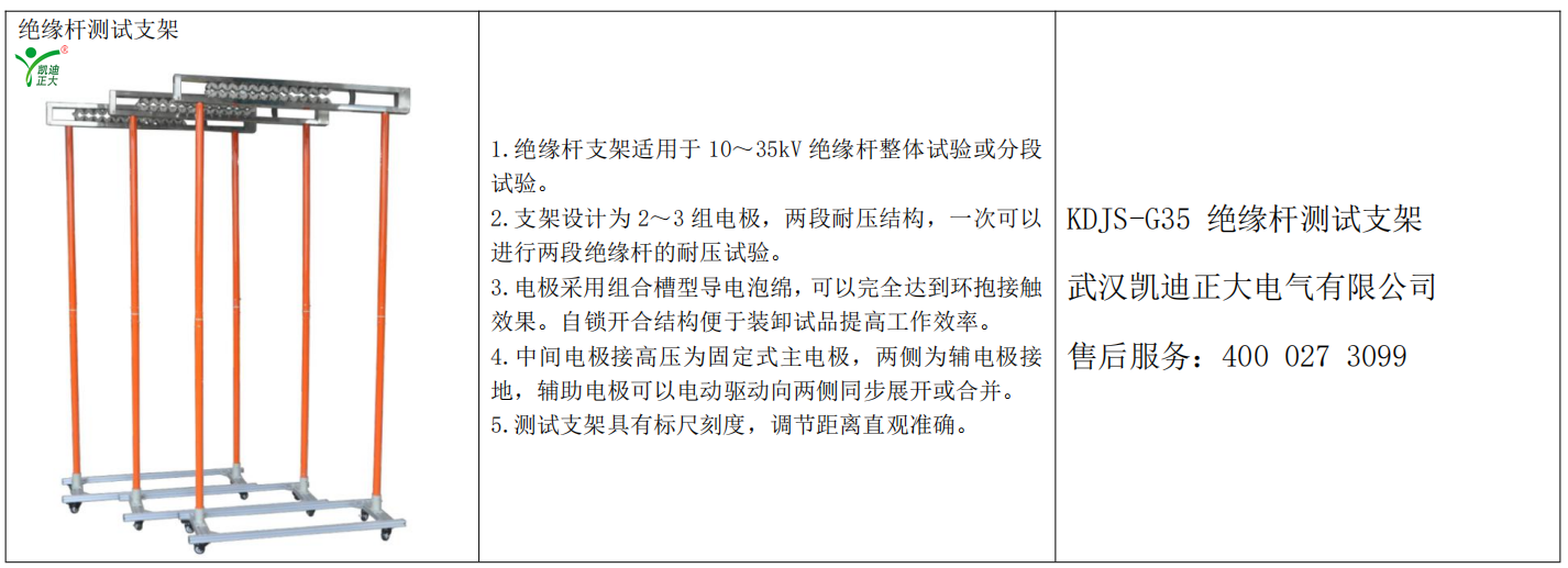 絕緣桿支架適用于10~35kV絕緣桿整體試驗或分段試驗。支架設計為2~3組電極,兩段耐壓結構,一次可以進行兩段絕緣桿的耐壓試驗。電極采用組合槽型導電泡綿,可以幾乎達到環抱接觸效果。自鎖開合結構便于裝卸試品提高工作效率。中間電極接高壓為固定式主電極,兩側為輔電極接地,輔助電極可以電動驅動向兩側同步展開或合并。測試支架具有標尺刻度,調節距離直觀準確。