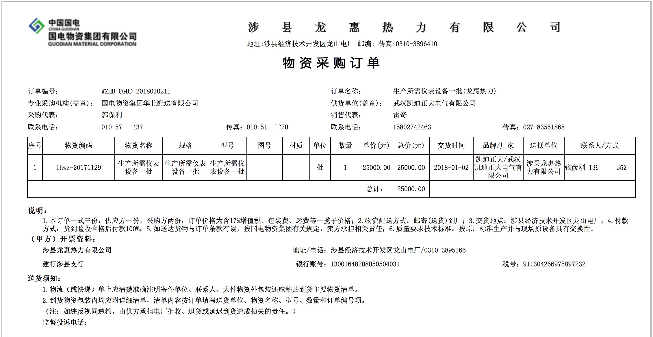 2018年元月,收到中國國電涉縣龍惠熱力電廠的項目中標通知。雖然中標金額不大,卻是武漢凱迪正大電氣有限公司2018年新年的首張中標通知書!!!為市場部感到高興。