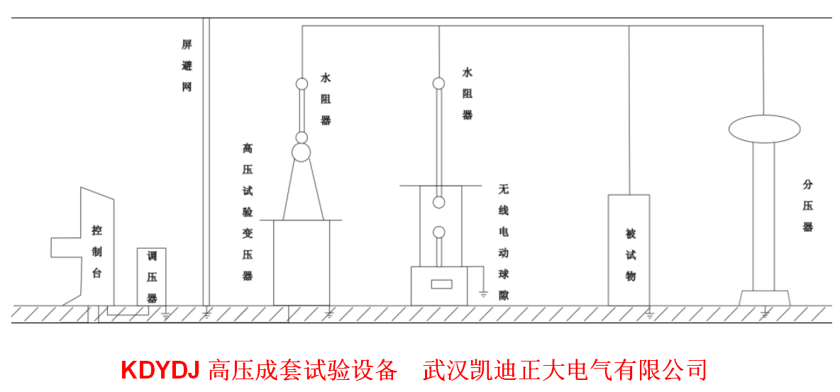 成套試驗(yàn)設(shè)備(包括YDJ高壓試驗(yàn)變壓器、KDYD控制臺、調(diào)壓器、以及球隙器、水電阻、分壓器和被試物)裝配聯(lián)結(jié)示意圖。