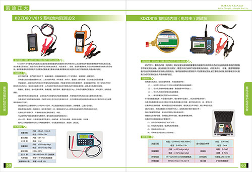 KDZD801/815蓄電池內阻測試儀抗干擾能力強,在嚴重干擾條件下,液晶屏最后一位數據能穩定在±1個字范圍內,讀數穩定,重復性好,采用最高新的液晶觸摸操作方式,人性化操作界面,外形美觀,體積小,重量輕,操作簡單,讀數穩定,重復性好。采用最高新液晶觸摸屏操作方式,人性化操作界面,外形美觀,體積小,重量輕,操作簡單,可以快速完成現場測量;存儲容量大,能夠在表內存儲5200節蓄電池的測試數據,并配備專用的計算機管理軟件,實現數據的存儲,同一塊電池不同時期技術狀態的對比,電池劣化趨勢分析等,從而實現可預見性地及時對蓄電池進行修復或者更換,避免發生電源斷電故障,智能化,數字化,全中文操作菜單,準確測量,操作簡單;重量不超過0.5kg,手持式與腰胯式雙重設計,單人操作,全程自動測量,滿足各種電池內阻檢測標準,須收錄齊全的蓄電池內阻參數數據庫,并能在儀表上進行結論性查詢和分析,也可將蓄電池測試數據用U盤導出到計算機軟件中生成圖表和曲線進行分析;測試報表可以方便的導入EXCELWord文件,并以指定的格式打印成報告,方便管理,以減少工作量,四端多用途測試夾,集測試夾,探針等功能于一體,能夠適應98%以上的電池連接安裝方式和電池連接安裝方式和電池極柱形式,在強紋波干擾情況下,可準確在線測試蓄電池電壓,內阻。可按照用戶需求定制更新儀表程序,最高新的交流放電測試方法;設計小巧,重量輕,方便使用者攜帶及操作,儀器功能,單節電池測量,成組電池測量,示波器,采用按鍵作操作也可以采用觸摸屏操作,可任意選擇測試夾,測試針,測試鉗。