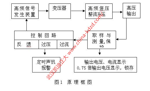 KDZG系列便攜式直流高壓發生器采用倍壓電路,率先應用最新的PWM脈寬調制技術,閉環調整,采用了電壓大反饋,使電壓穩定度大幅度提高。該發生器具有紋波系數小、輸出穩定可靠,體積小、重量輕的特點,且具有可靠、靈敏的內部保護功能,其原理框圖如圖1所示。