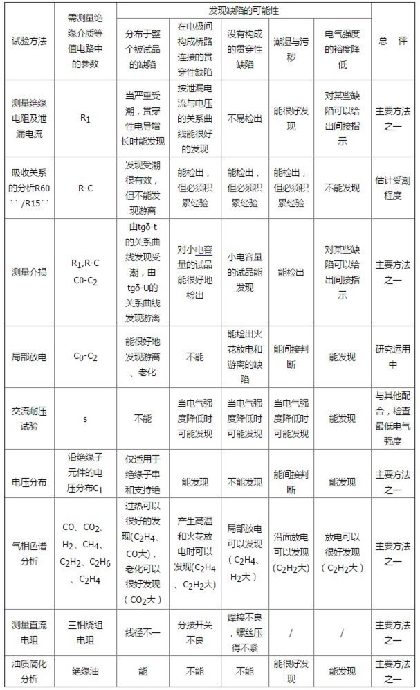 從表中可見,每種試驗方法都只能發(fā)現(xiàn)某一方面的絕緣缺陷,因此,單靠一種試驗方法,有時很難判斷絕緣好壞,須根據(jù)各種試驗方法的特點和試驗結(jié)果,相互比較與補充,力求作出準確的判斷。這就要求我們在實際工作中,掌握各種試驗方法,注意提高綜合試驗分析的能力。