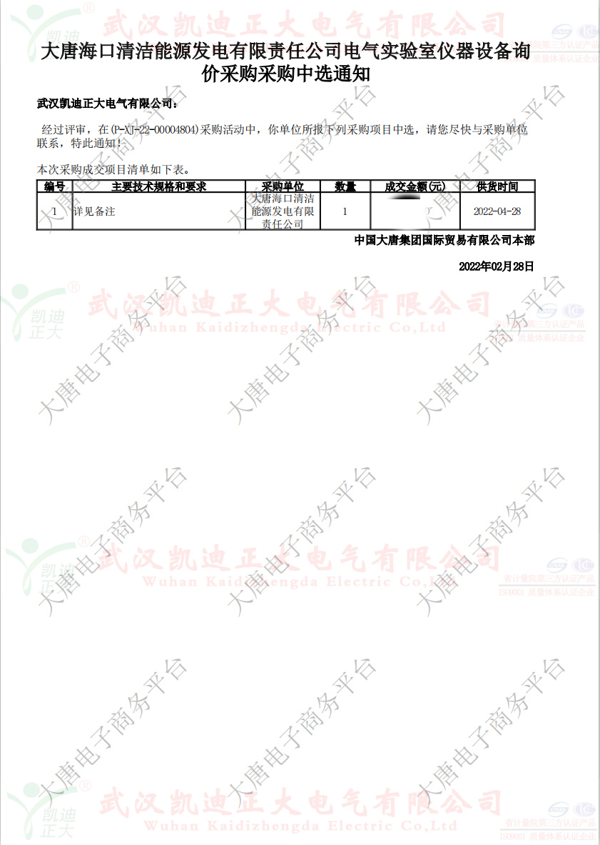 遲日江山麗,春風花草香。祝賀我司商務部再次接到中國大唐??谇鍧嵞茉窗l(fā)電有限責任公司電氣實驗室儀器設備詢價采購采購中選通知。