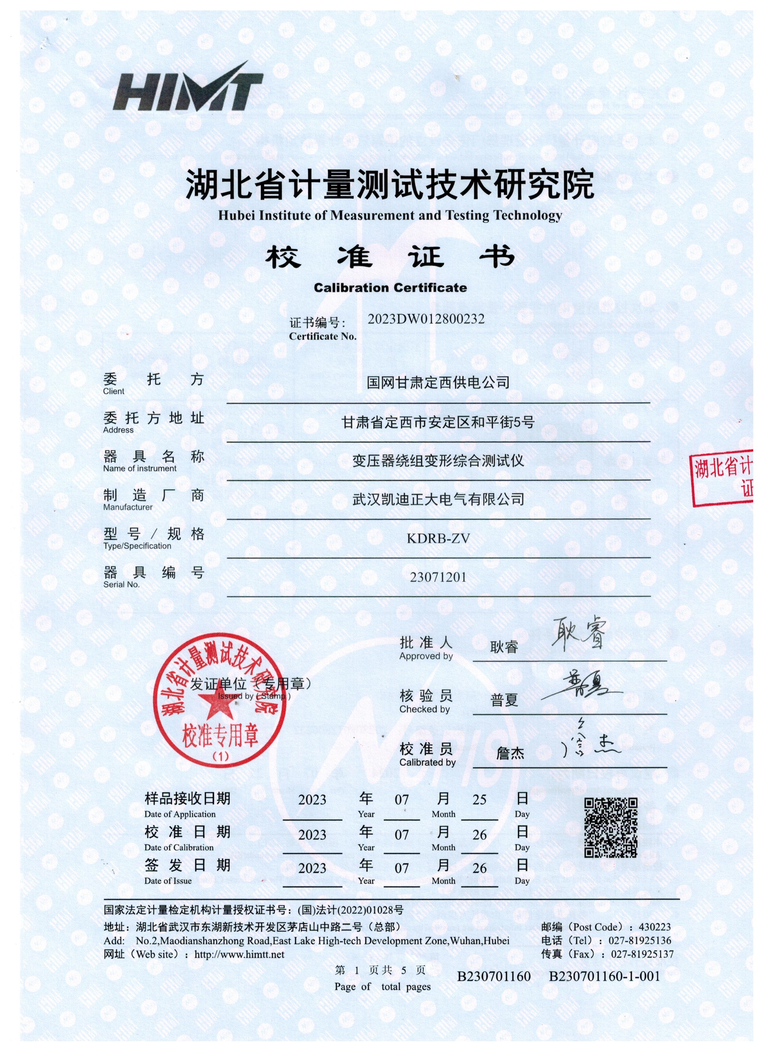 KDRB-ZV變壓器繞組變形綜合測試儀特性及技術參數獲得湖北省計量測試技術研究院的校準證書,設備為電力工業電氣設備質量檢驗測試中心的要求。