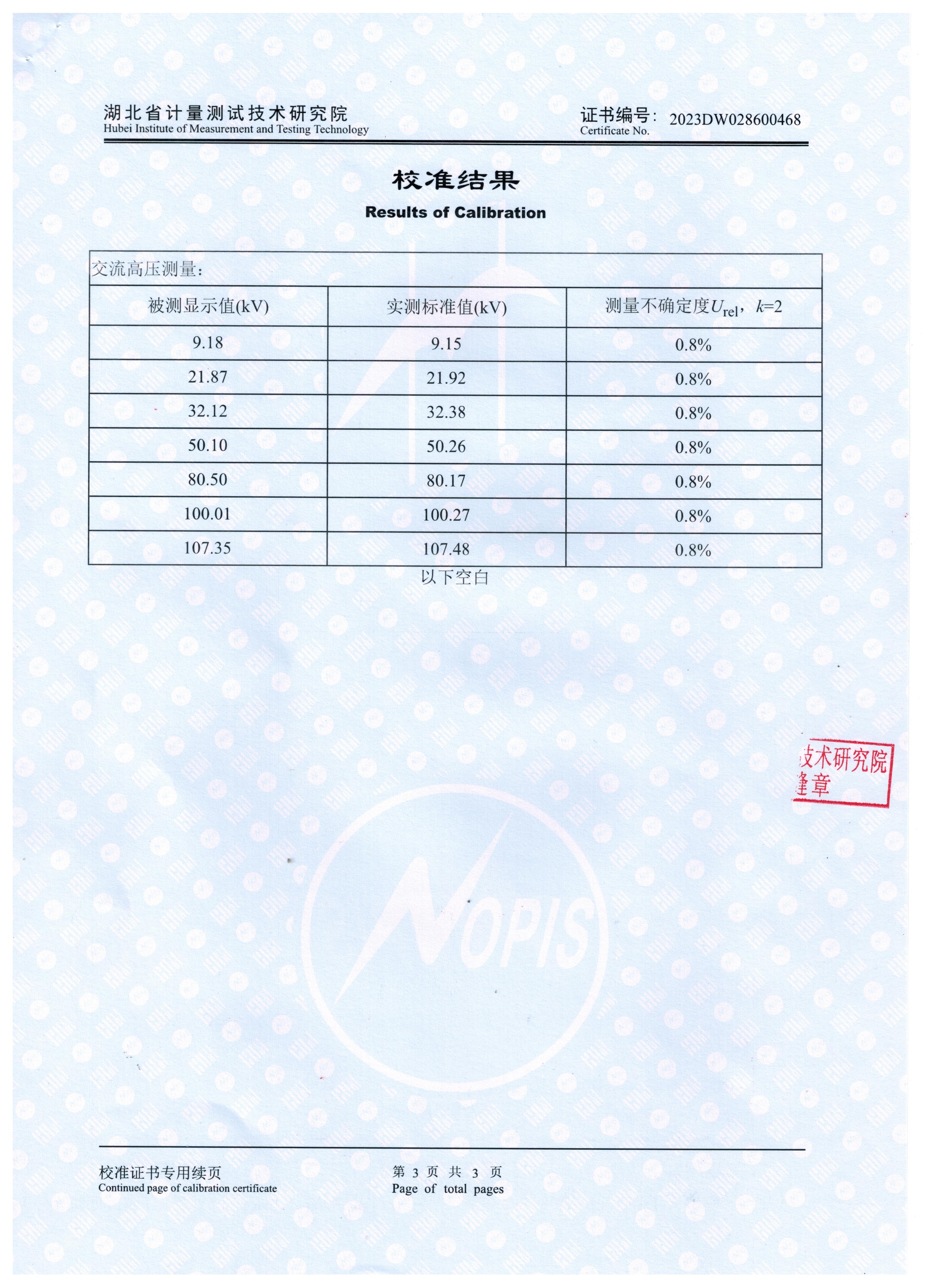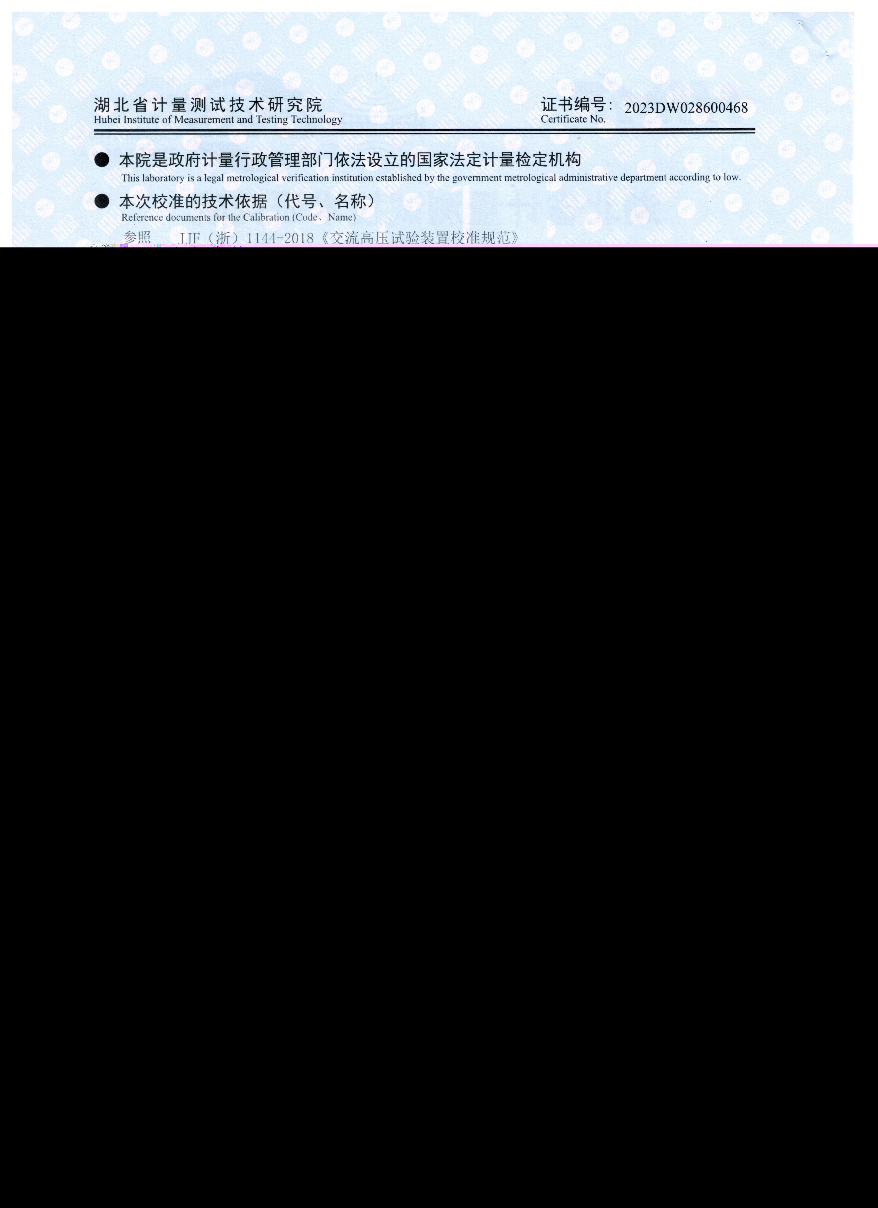 參照  JJG(浙)1144-2018《交流高壓試驗裝置校準規范》 檢定要求,KDXZ-II-108kVA/108kV  變頻串聯諧振試驗裝置獲得2023DW028600468檢定證書。